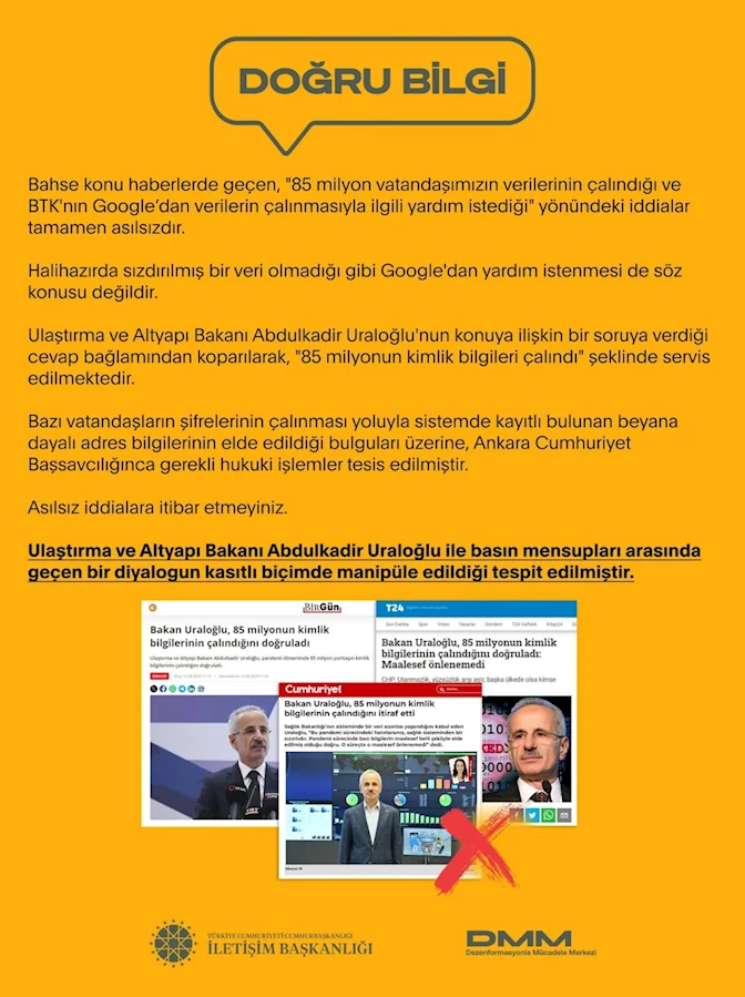 Bahse konu haberlerde geçen, "85 milyon vatandaşımızın verilerinin çalındığı ve BTK'nın Google’dan verilerin çalınmasıyla ilgili yardım istediği" yönündeki iddialar tamamen asılsızdır.