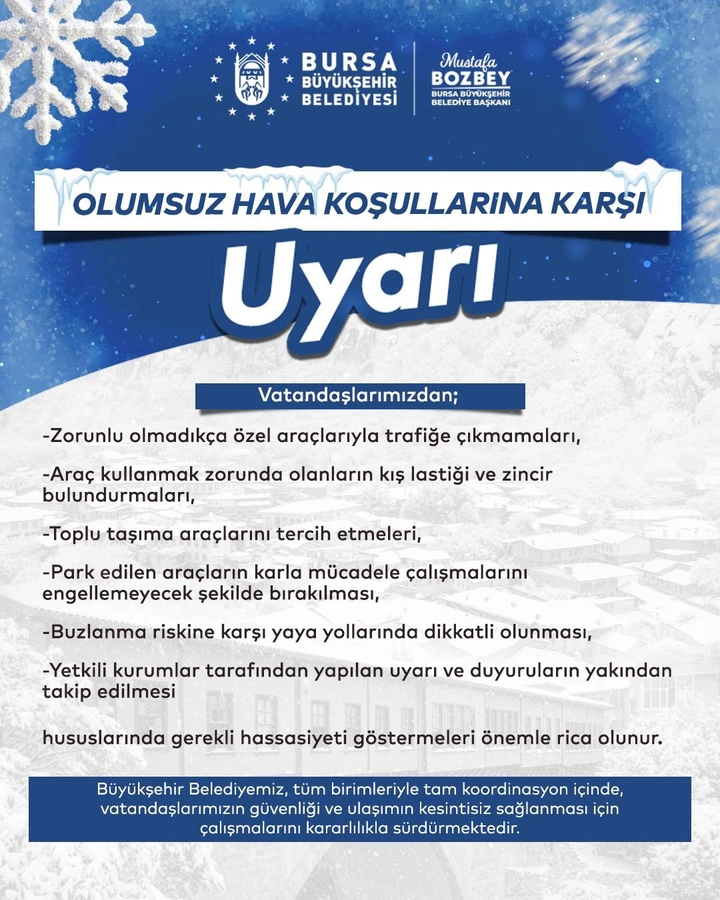Belediyeden yapılan duyuruda, zorunlu olmadıkça özel araçlarla trafiğe çıkılmaması, araç kullanmak zorunda olan sürücülerin ise kış lastiği ve zincir bulundurması gerektiği vurgulandı. Vatandaşların, ulaşımda mümkün olduğunca toplu taşıma araçlarını tercih etmeleri çağrısında bulunuldu.