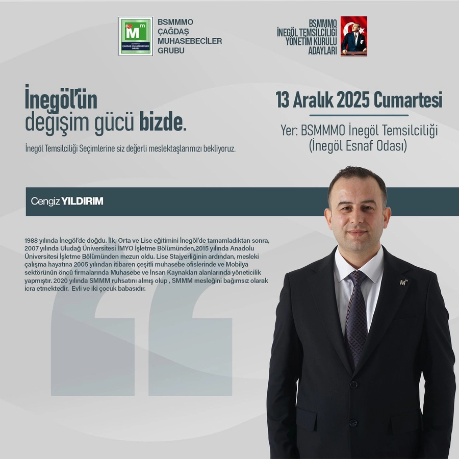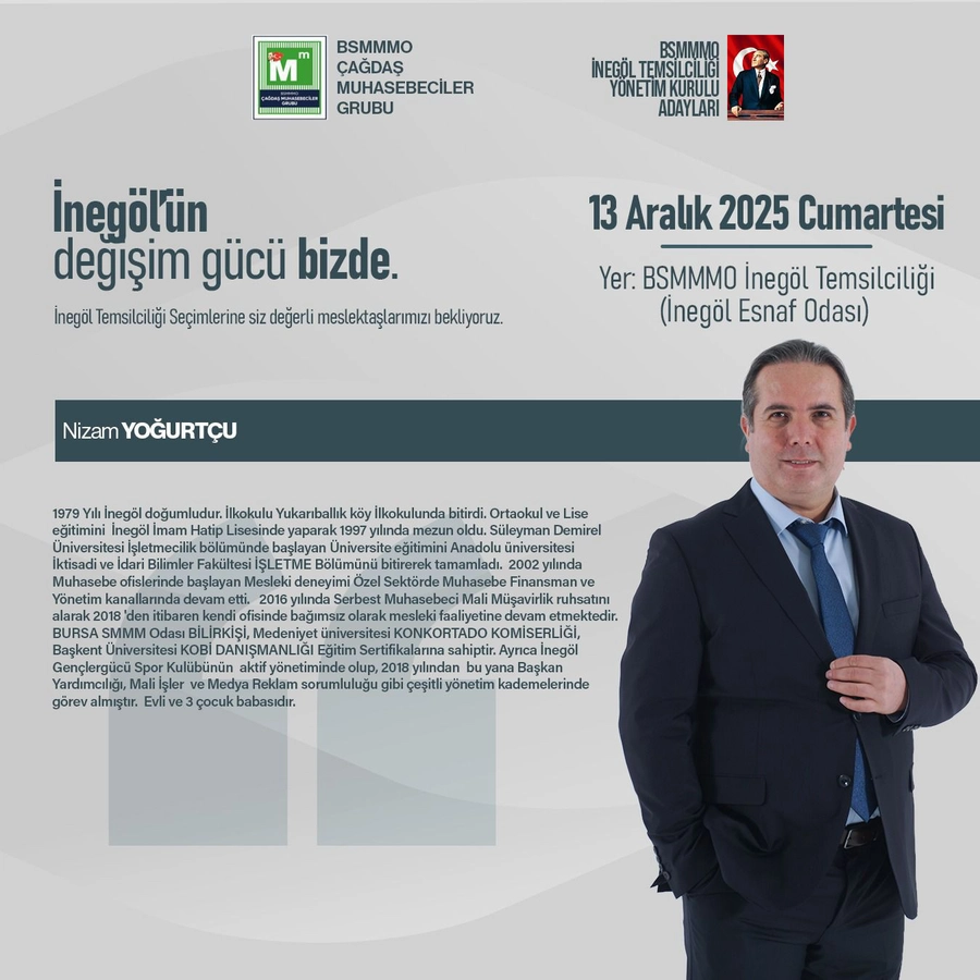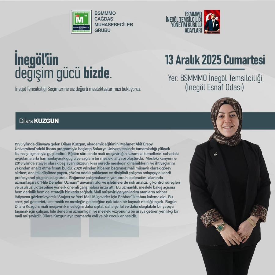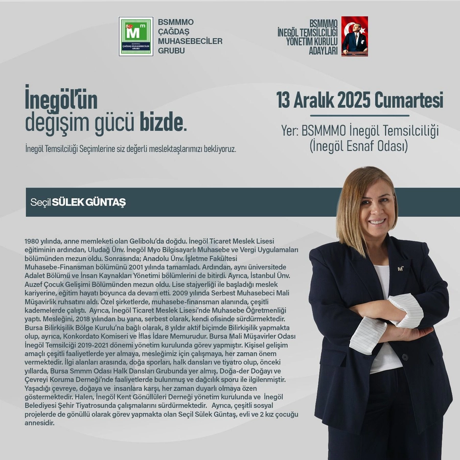 Bursa Serbest Muhasebeciler Mali Müşavirler Odası (SMMMO) İnegöl Temsilciliği’nde 13 Aralık 2025 Cumartesi günü gerçekleştirilecek seçimlerde Meslekte Dayanışma ve Birlik Grubu ile Çağdaş Grup yarışacak. Çağdaş Grup’un başkan adayı Seçil Sülek Güntaş, meslektaşlara yönelik yol haritasını ve projelerini kamuoyuyla paylaştı.