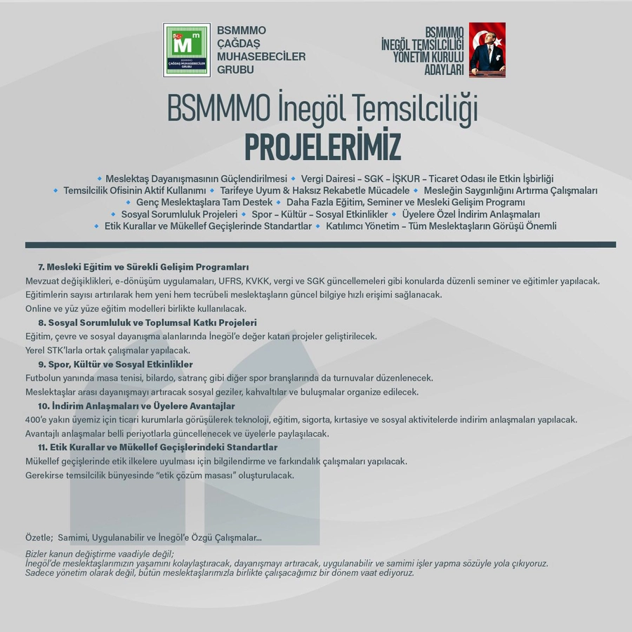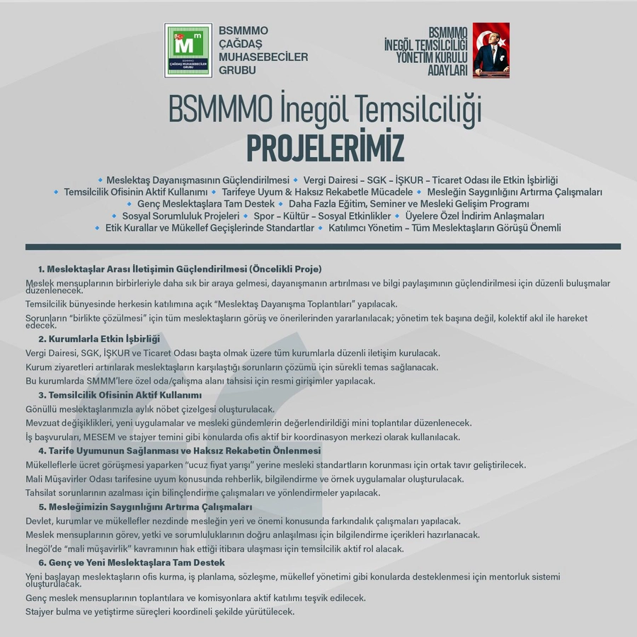 Güntaş, meslekte en önemli ihtiyaçlardan birinin güçlü iletişim olduğunu belirterek düzenli buluşmalar, çalıştaylar ve “Meslektaş Dayanışma Toplantıları” ile ortak sorunların kolektif akıl ile çözüleceğini ifade etti. Vergi Dairesi, SGK, İŞKUR ve Ticaret Odası gibi kurumlarla daha etkin işbirliği kurulacağını, temsilcilik ofisinin ise aktif bir koordinasyon merkezi olarak kullanılacağını söyledi.