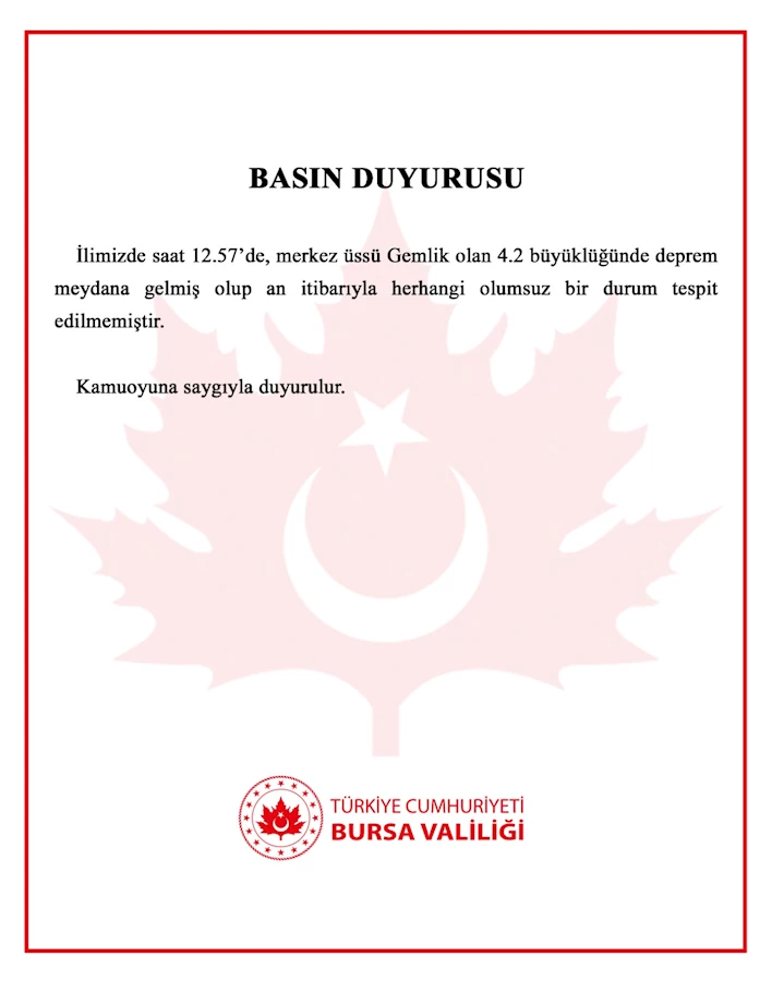 Bursa Valiliği, "İlimizde saat 12.57'de, merkez üssü Gemlik olan 4.2 büyüklüğünde deprem meydana gelmiş olup, deprem sonrası olumsuz bir durum tespit edilmemiştir." şeklinde paylaşım yaptı.