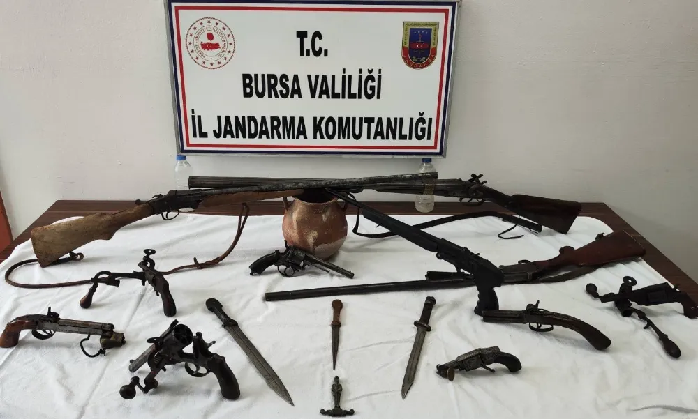 Bursa İl Jandarma Komutanlığı ekiplerince 6 Ocak 2026 tarihinde yürütülen çalışma kapsamında, 1 şüpheliye ait ikamette arama yapıldı. Aramalarda, 7 adet tarihi eser niteliğinde olduğu değerlendirilen tabanca, 4 adet tarihi eser niteliğinde olduğu değerlendirilen tüfek, 3 adet tüfek aparatı, 1 adet barut doldurma aparatı, 1 adet tarihi eser niteliğinde mühür, 1 adet tarihi eser niteliğinde küp, 1 adet tarihi eser niteliğinde obje ile 3 adet hançer ele geçirildi.