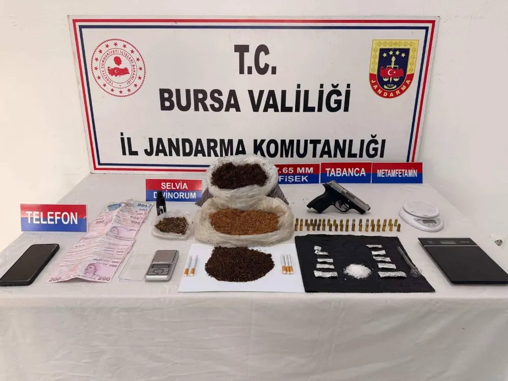 Bursa İl Jandarma Komutanlığı ekiplerince 6 Ocak 2026 tarihinde gerçekleştirilen operasyon kapsamında, bir şahsın ikametinde arama yapıldı. Aramalarda 1 kilogram A.M. maddesi emdirilmiş sentetik kannabinoid, 18 gram metamfetamin, 30 gram Selvia Divinorium, 32 gram likit A.M. maddesi, 3 adet hassas terazi, 1 adet ruhsatsız tabanca, 37 adet 7.65 milimetre çapında fişek, 8 bin 300 lira nakit para ile 1 adet cep telefonu ele geçirildi.