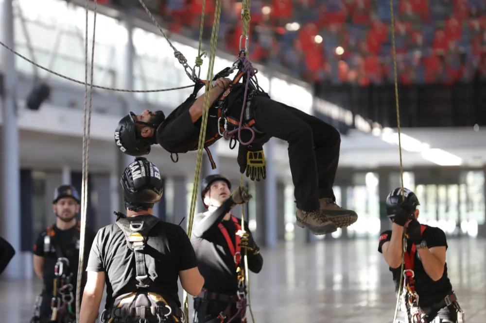 Bursa Büyükşehir Belediyesi, afetlere dirençli kent vizyonu doğrultusunda, BAM başta olmak üzere tüm ilgili birimlerin eğitim ve hazırlık faaliyetlerini aralıksız sürdürmeye devam ediyor. Merinos Yerleşkesi Fuaye Alanı’nda ‘İple Kurtarma Sistemleri ve Arama-Kurtarma eğitimi’ alan ekipler, uzman eğitmenler eşliğinde tavana asılı halatlara güvenlik ekipmanlarını kullanarak tırmandı. Yüksekten erişim, dar alanlara giriş, dikey kurtarma ve zorlu koşullarda güvenli müdahale kabiliyetlerinin geliştirilmesinin amaçlandığı eğitimde, teorik ve pratik bilgiler verildi. Eğitimde, personelin kişisel güvenliği, ekipman kullanımı, düğüm teknikleri, ip sistemleri ve koordineli kurtarma senaryoları uygulandı.
