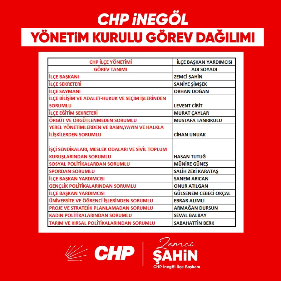 CHP İnegöl İlçe Başkanlığı’nın yeni yönetim kurulu görev dağılımı şu şekilde: