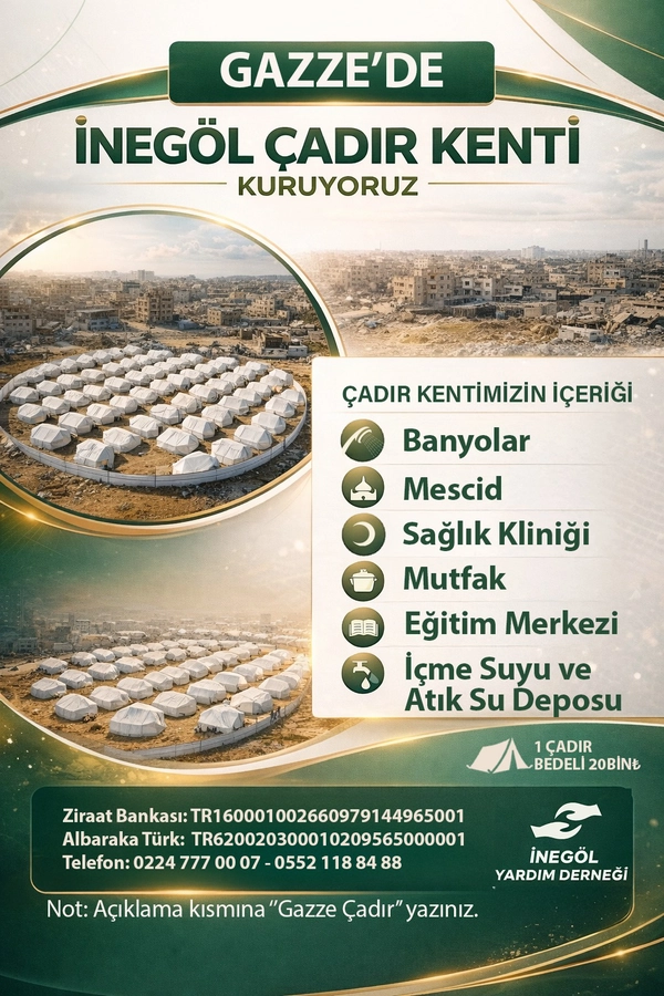 “ilk proje kapsamında Gazze’de “İnegöl Çadır Kenti” kurmayı hedefliyoruz. Toplam 1000 çadır planladığımız “çadır kentte”, her biri 25-30 metrekare büyüklüğünde, sıcak, soğuk ve yağmur şartlarına dayanıklı çadırlar yer alacak. Çadır kentte ayrıca su kuyusu, banyo, mutfak, mescit, temel eğitim merkezi ve sağlık kliniği gibi sosyal donatı alanları da bulunacak. Her bir çadırda ortalama 6 kişinin barınmasını planlanıyoruz. Bir çadırın maliyetinin 20 bin TL” olacaktır.