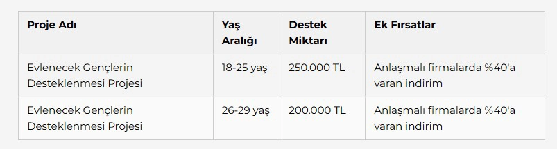 Destek paketi kapsamında 18-25 yaş arası çiftlere 250 bin TL, 26-29 yaş arası çiftlere ise 200 bin TL destek sağlanacak.