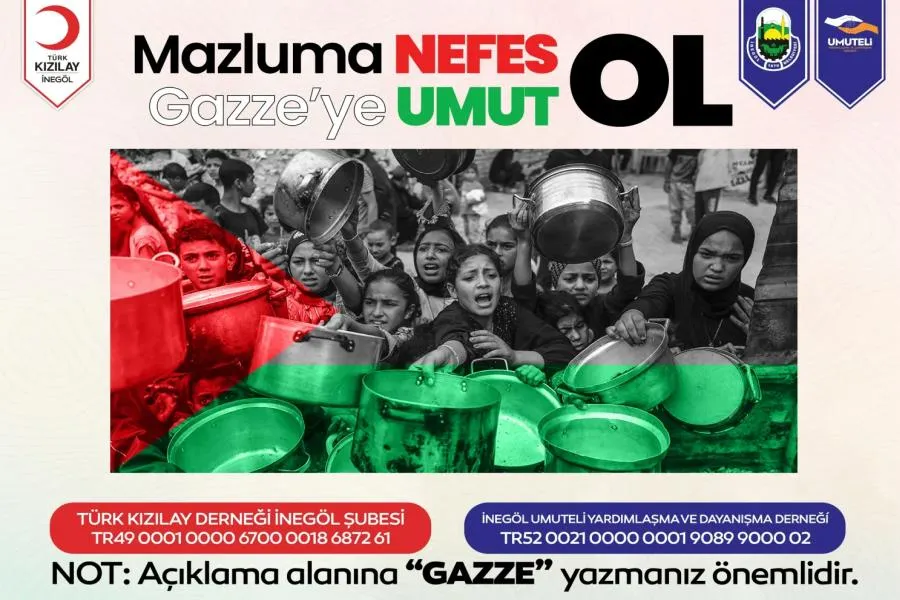 1 aylık bir kampanya başlatıldığını vurgulayan Başkan Alper Taban, şöyle konuştu: “Yardımların toplanacağı hesapların iban numaraları sosyal medya hesaplarımızda, web sayfalarımızda ve ilgili duyuru metinlerinde de paylaşılacak. Türk Kızılay Derneği İnegöl Şubesi’nin TR49 0001 0000 6700 0018 6872 61 iban numarası ve İnegöl Umuteli Yardımlaşma ve Dayanışma Derneği’nin TR52 0021 0000 0001 9089 9000 02 iban numaralarından yardımlar ulaştırılabilir. Ancak vatandaşlarımızın yardımları gönderirken açıklama kısmına özellikle “Gazze” yazması önemli.”