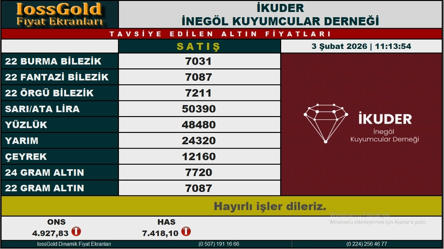 İnegöl Kuyumcular Çarşısı'nda dün 7 bin lira seviyelerine kadar gerileyen gram altın bugün bir miktar toparlanma ile 11.15 itibariyle 7.418 seviyelerinden işlem görüyor. ONS ise aynı saatlerde 4.927 dolar seviyelerinde..