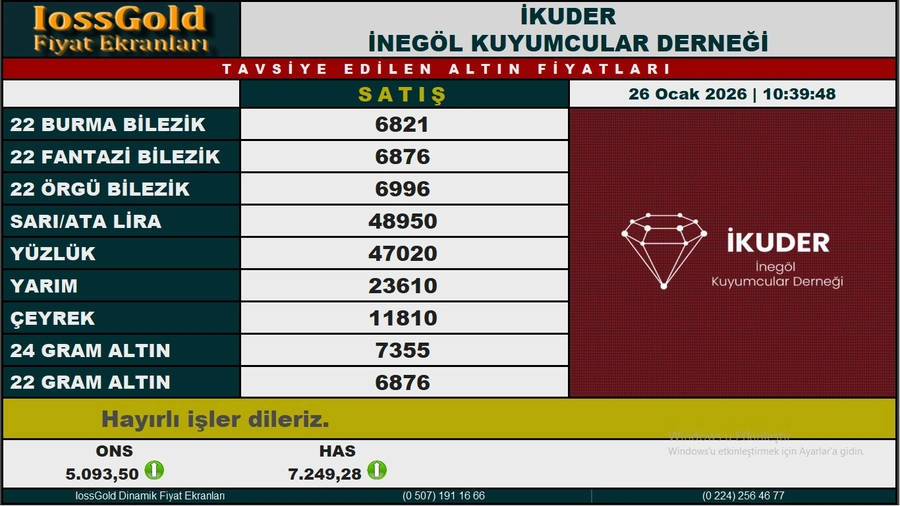 İnegöl Sarraflar Çarşısında 10.40 sıralarında altının gramı 7 bin 249 liradan işlem görüyor.