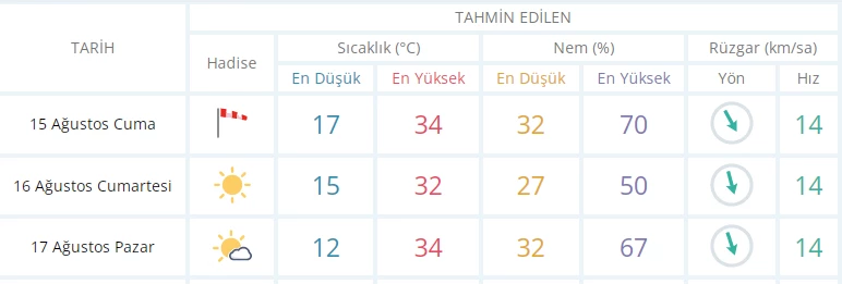 Pazar günü hafif bulutlu. En düşük sıcaklık 12, en yüksek sıcaklık 34 derece.