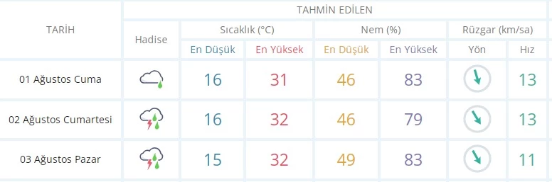Meteoroloji verilerine göre Cumartesi ve Pazar günleri yağmur bekleniyor. Termometreler her iki günde de en düşük 15, en yüksek 32 dereceyi gösterecek.