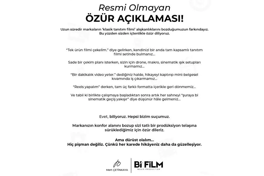 Görselde yer alan açıklamada ajans, müşterilerinin “tek ürün filmi çekelim” talebiyle gelirken bir anda kendilerini kapsamlı bir tanıtım filmi setinde bulmalarından, sade planlar isterken drone ve sinematik ışık setuplarıyla karşılaşmalarından dolayı espriyle karışık özür diliyor.