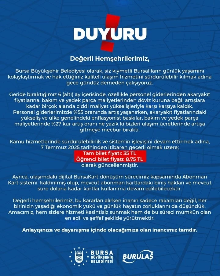 Bursa Büyükşehir Belediyesi tarafından yapılan açıklamada, personel giderleri, akaryakıt fiyatları, bakım ve yedek parça maliyetlerinde yaşanan kur artışına bağlı yükselişlerin zam kararında etkili olduğu belirtildi. Son 6 ayda personel giderlerinde %55, bakım ve yedek parça maliyetlerinde %27 oranında artış yaşandığına dikkat çekilerek, ekonomik baskılar nedeniyle bu düzenlemenin zorunlu hale geldiği ifade edildi.