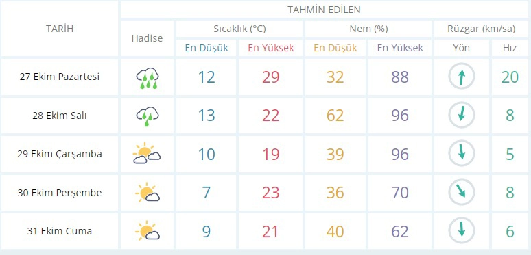 Çarşamba parçalı bulutlu hafif güneşli. En düşük sıcaklık 10, en yüksek sıcaklık 19 derece.