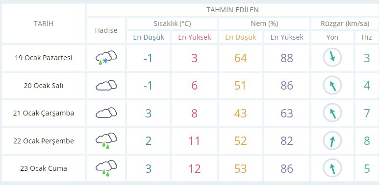 Yarın (Salı) en düşük sıcaklık -1, en yüksek sıcaklık 6, hava kapalı.