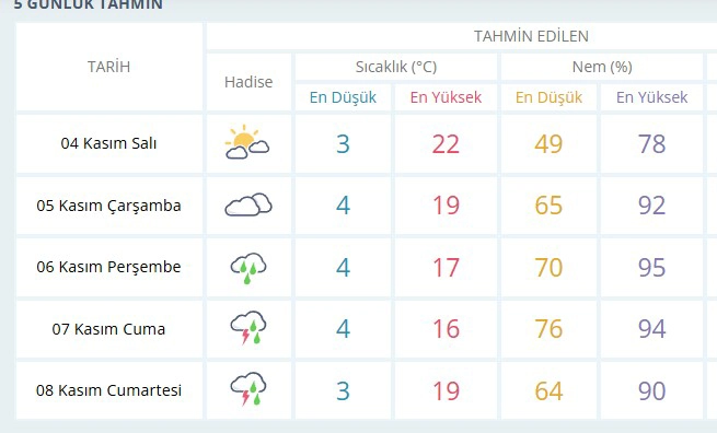 4 Kasım Salı günü parçalı bulutlu bir hava beklenirken sıcaklık en düşük 3, en yüksek 22 derece olacak. Çarşamba günü hava çok bulutlu, sıcaklık 4 ile 19 derece arasında seyredecek.